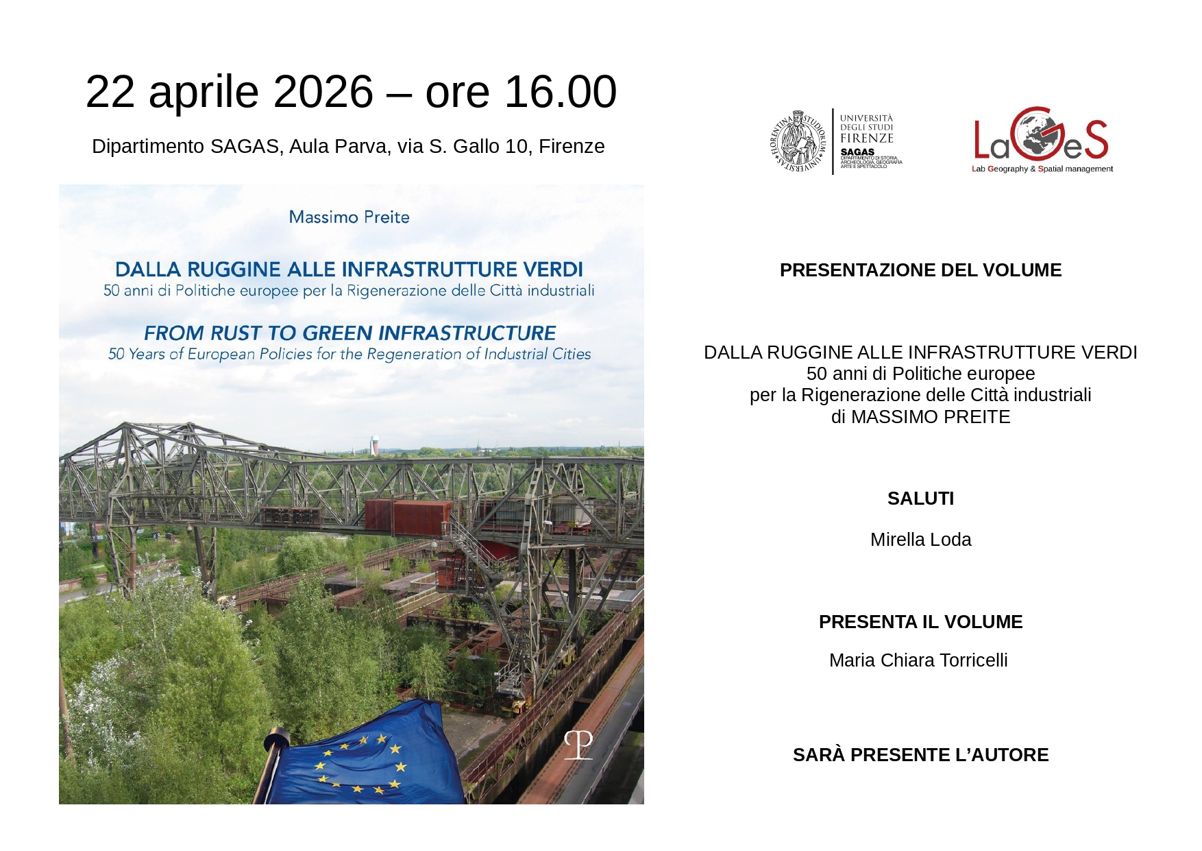 Informiamo studenti e studentesse che il 22 aprile 2026, alle ore 16.00, si terrà la presentazione del volume di Massimo Preite: Dalla ruggine alle infrastrutture verdi / From Rust to Green Infrastructure 50 anni di Politiche europee per la Rigenerazione delle Città industriali / 50 Years of European Policies for the Regeneration of Industrial Cities